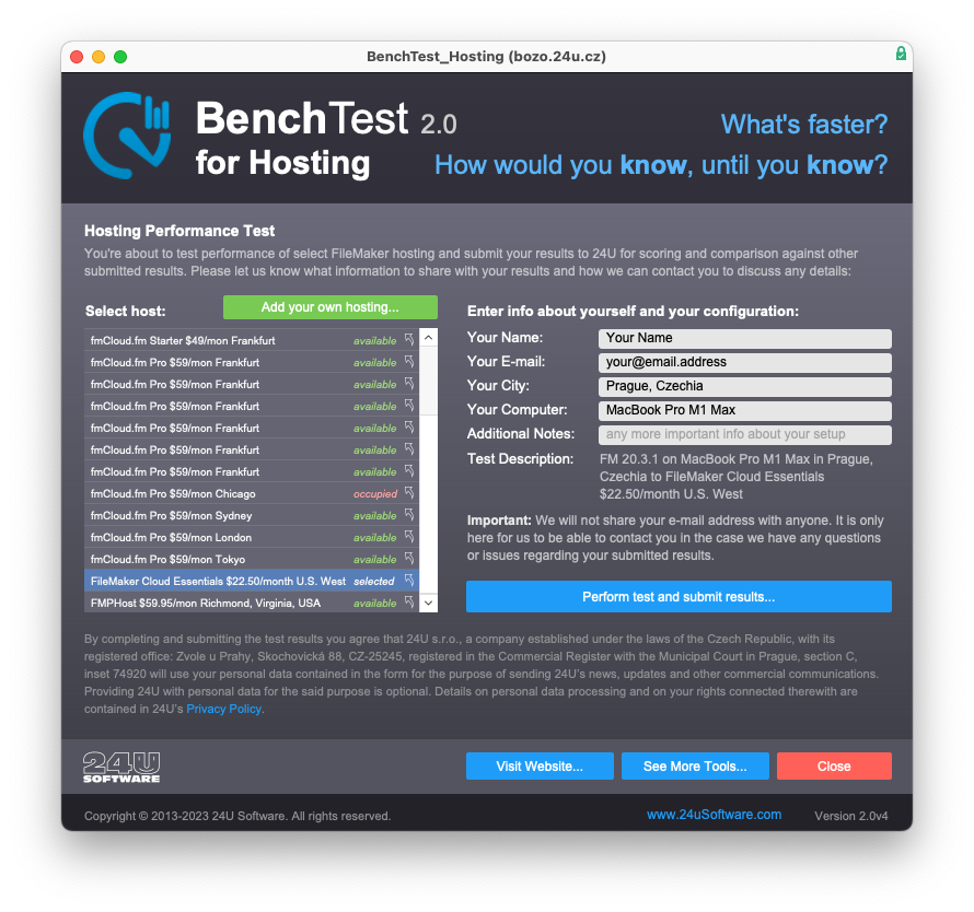 Wondering which hosting or data center to chose for your cloud-hosted FileMaker solution? Test different options with BenchTest Hosting Edition and compare your results and the results submitted by the community in a dedicated Hosting section of our results below. To try it out yourself, just have FileMaker Pro ready to run the test for up to a few hours, and click here to start.
