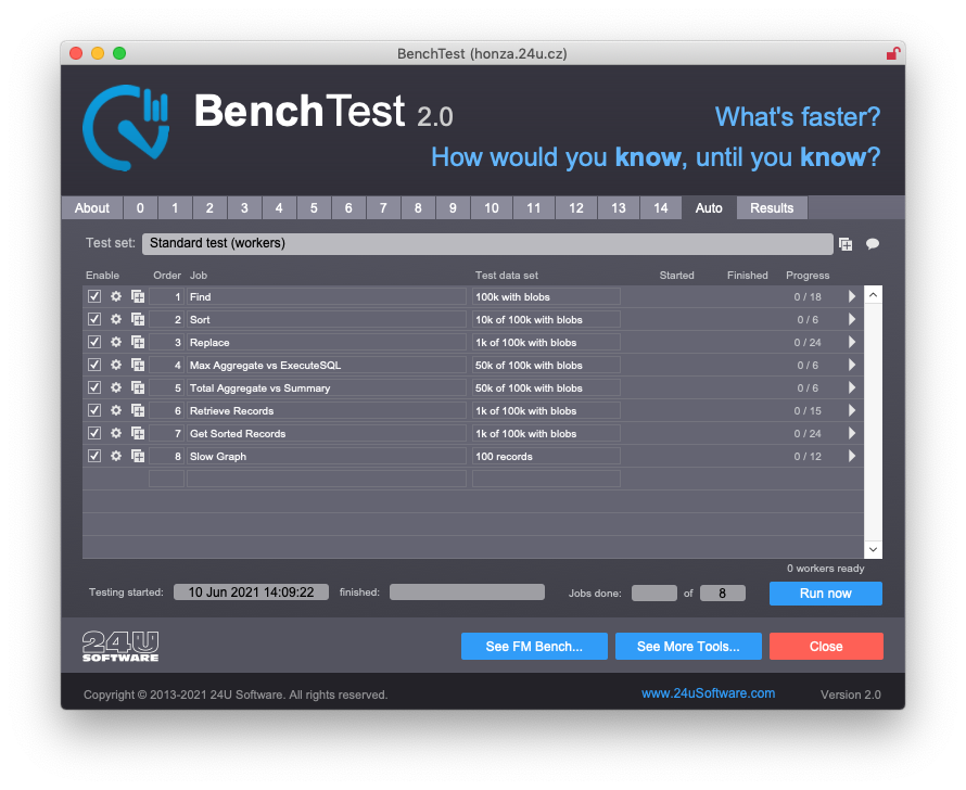 BenchTest also comes with an easy way to automate repeating the same series of tests on different FileMaker versions or different configurations. You can also perform the tests on multiple workers to test how your FileMaker Server will really handle multiple concurrent clients. BenchTest will automatically coordinate starting each step on all workers at the same time.