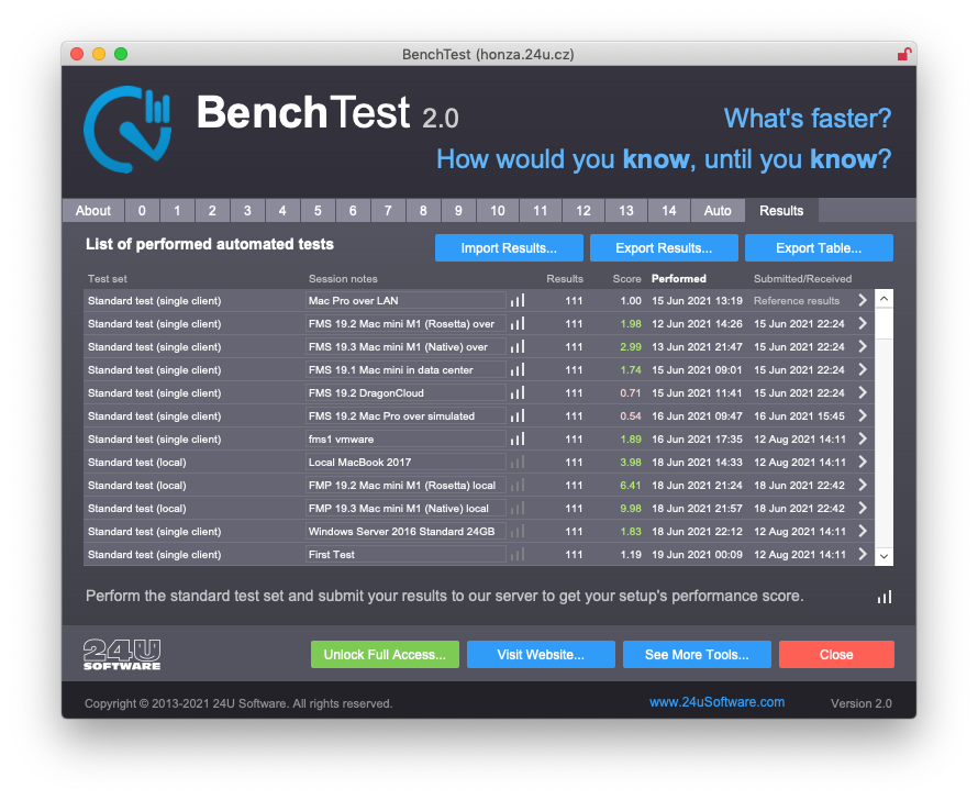 Pre-defined “standard test” set consisting of exactly 111 tests will let you submit your test results to our server and get your setup’s performance scored by comparing it to our reference results. The overall score is calculated as a weighed average of the 111 individual tests with our intention for higher score to mean “faster configuration” for usual FileMaker solution tasks. You can check all valid results compared below on this page.