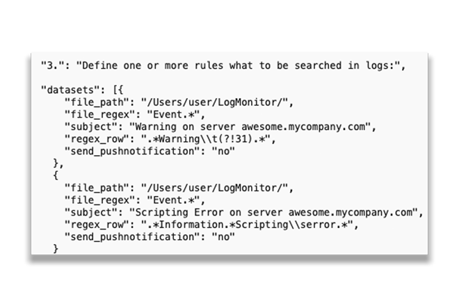 In addition to sending e-mails, LogMonitor can send push notifications to your smart phone via Pushover. You can enable push notifications separately for each pattern, so you can get push notifications for urgent issues and only e-mail notifications about things that do not require immediate attention.