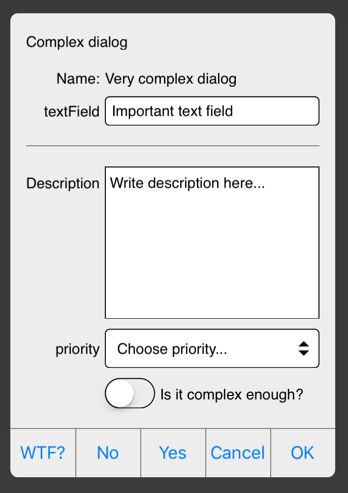 SDialog_InputDialog( "Complex dialog" ; "Ok¶Cancel¶Yes¶No¶WTF?" ; "caption¶Name:" ; "Very complex dialog" ; "text¶textField" ; "Important text field" ; "separator" ; "textArea¶Description¶lines=8" ; "Write description here..." ; "menu¶priority" ; "Very High¶High¶Normal¶Low¶Very Low" ; "Choose priority..." ; "checkbox¶Is it complex enough?" ; 0 )
